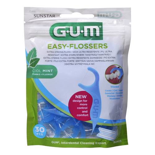 SUNSTAR G•U•M EASY-FLOSSERS Forcella per una semplice impugnatura ed un migliore controllo. Collo angolato per raggiungere i denti posteriori. Filo interdentale che scivola con facilità tra i denti e resiste a sfilacciamenti, strappi e pieghe. Gusto menta.