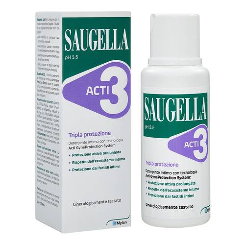 Saugella Acti3 è utilizza la tecnologia Acti GyneProtection System ideata da Saugella. La sua formula è testata clinicamente e scientificamente per assicurare una triplice protezione. L'estratto di timo (Thymus vulgaris), un antibatterico naturale, e lo zinco (zinc coco-sulfate) svolgono un'efficace azione sinergica e protettiva anche nelle situazioni più a rischio. Inoltre, il mix bilanciato di bio-polimeri (complesso muco-adesivo) contenuti in Saugella Acti3 crea un film invisibile sull'epitelio vulvare prolungandone l'efficacia nel tempo. La sua formula è scientificamente testata per non alterare l'epitelio vulvare e per aiutare il mantenimento della corretta idratazione. Aiuta a mantenere o ripristinare il pH dell'area vulvare, che rappresenta una barriera protettiva naturale.